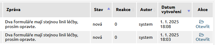 Výsledky vyhledávání zobrazíme kliknutím na tlačítko „HLEDEJ“. Případné pokročilé vyhledávání a řazení výsledků funguje stejně jako u vyhledávání pacientů. Lze tedy hledat např. pouze queries ve stavu „nová“, queries na konkrétním pacientovi nebo konkrétním formuláři (dle zvolených kritérií).